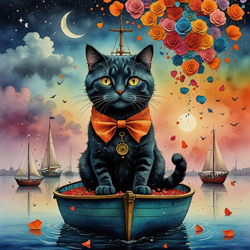 A surrealist cat sails through a misty sky amidst rose petals. This painterly image features vibrant colors and a dreamy, magical atmosphere.
