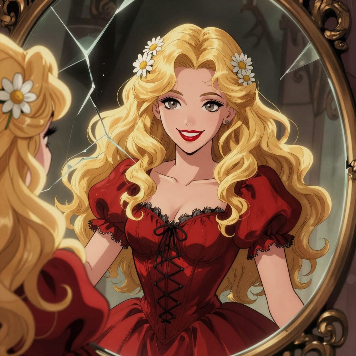 Beautiful magical Alice with long curly blonde hair with daisies in her hair, rounded symmetrical facial features, beautifully made up red lips, happy smiling face, wearing a gothic red dress with corset, seen through a broken mirror. Mark Brooks and Dan Mumford, comic book artwork, perfect, smooth