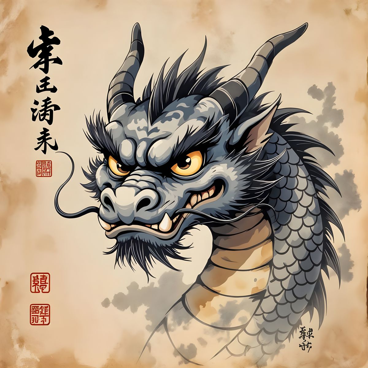 This image shows a whimsical, grumpy dragon rendered in an ancient ink wash painting style on weathered Chinese parchment. Features soulful eyes and simplified anatomy, evoking Zen minimalism.