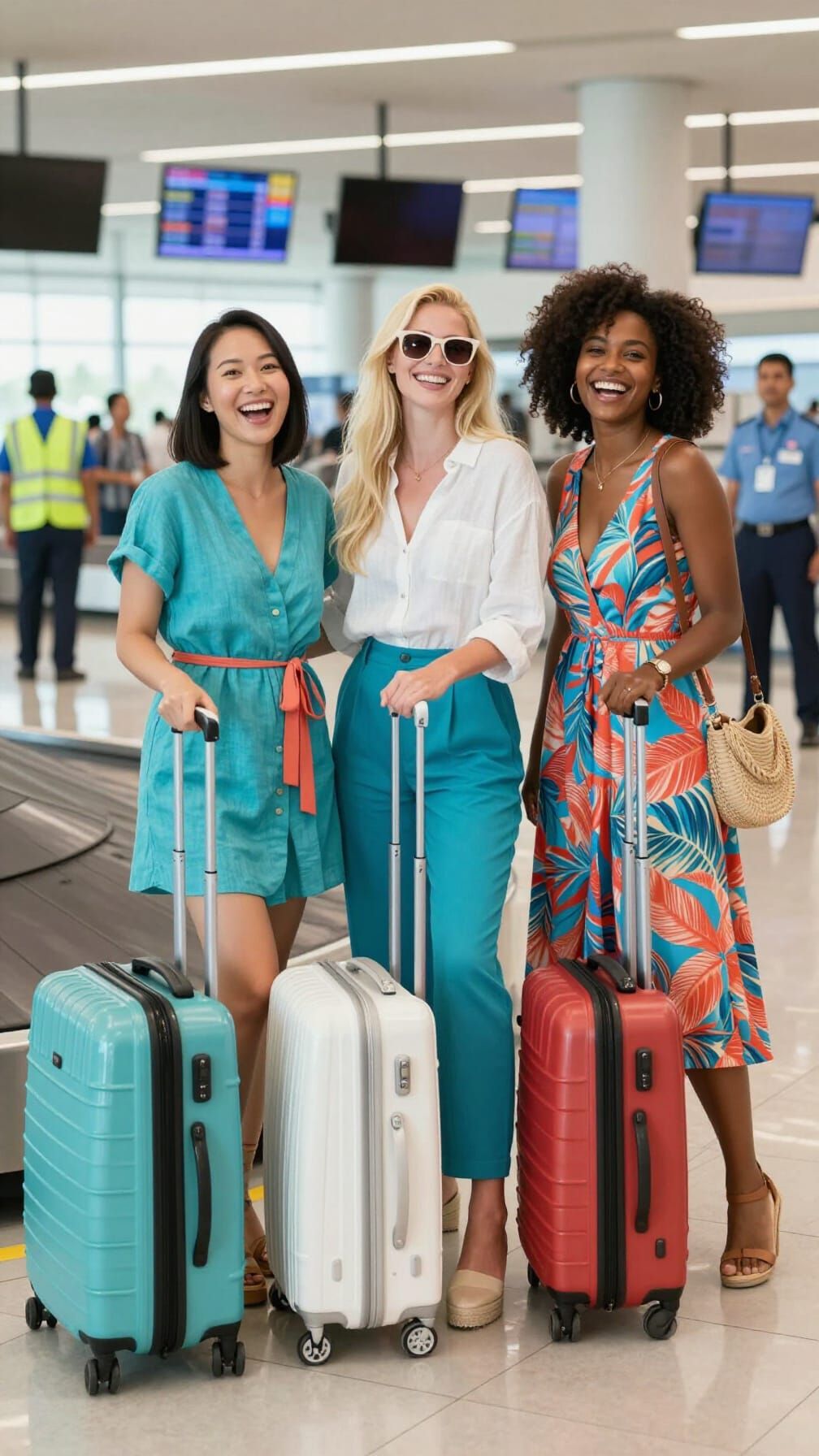 This image shows three smiling young women of diverse backgrounds excited to begin their vacation at the Maldives airport baggage claim, holding colorful suitcases.