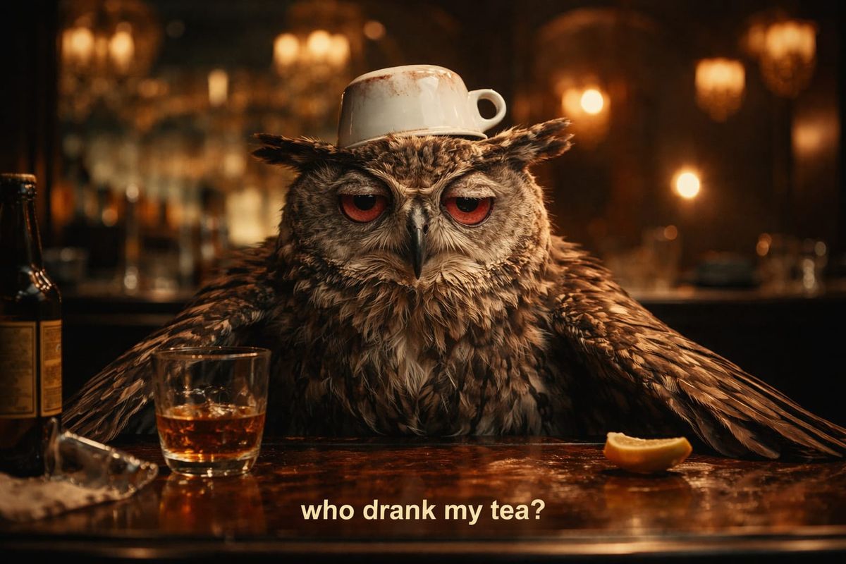 A cinematic image of a tipsy owl at a fancy bar, teacup askew, staring blankly. Captured with film grain and dramatic lighting for an atmospheric, high-quality look.