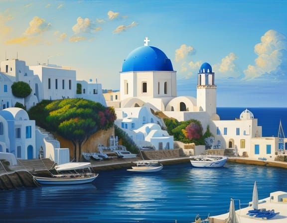 This image shows a picturesque Santorini village with blue domes against the Mediterranean Sea. Majestic ships sail on the water under a sunny sky. Rendered in a hyperrealistic, impasto style with thick, expressive brushstrokes and vibrant colors.
