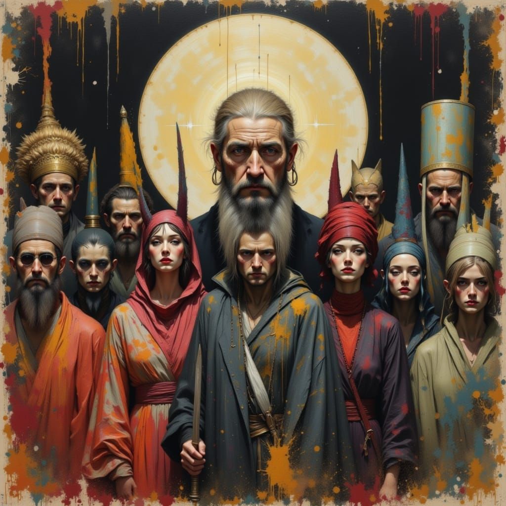 A striking concept art portrait of a book cover titled 'The Almanac of Cult Leaders and their Bodyguards', featuring stylized figures in dynamic lighting. Rendered in a soft oil pastel style with vibrant, triadic colors.