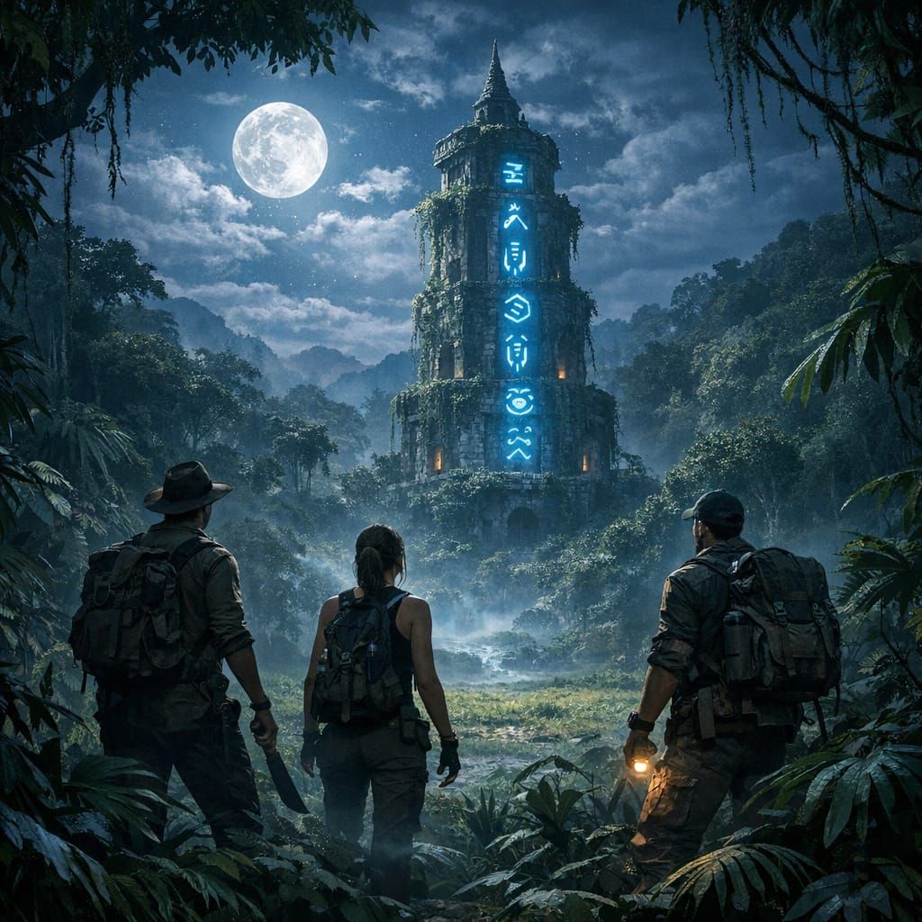 This image shows adventurers emerging into a jungle clearing, spotting a distant tower adorned with softly glowing glyphs under the moonlight.
