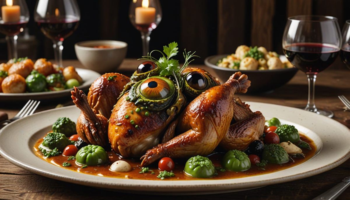This image showcases a fantasy art plating of cryptid monster chicken and lizard eyeballs in wine sauce. Detailed food styling creates a magical culinary masterpiece with rich, earthy tones and vibrant green sauce.
