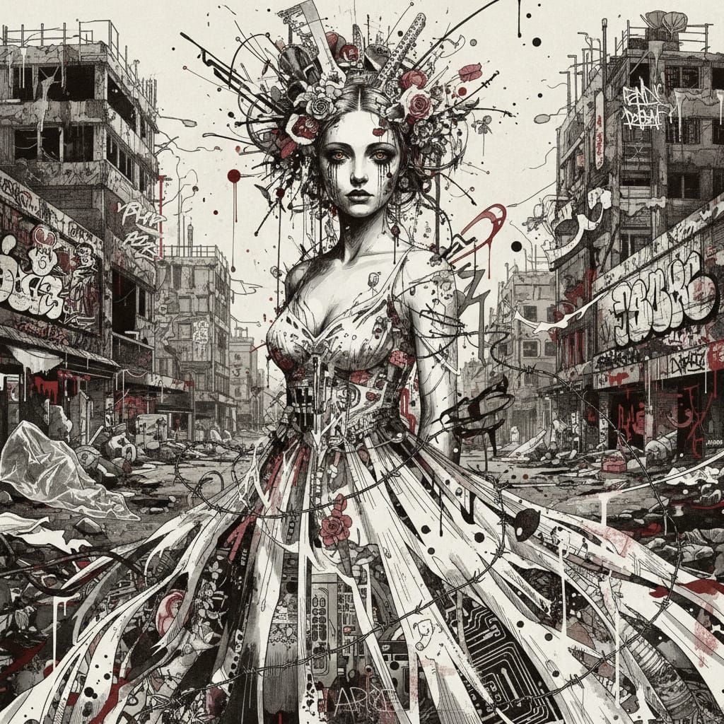 This striking digital illustration features an elegant lady in white, rendered with abstract punk collage elements and urban graffiti textures. The artwork conveys a moody, melancholic atmosphere.