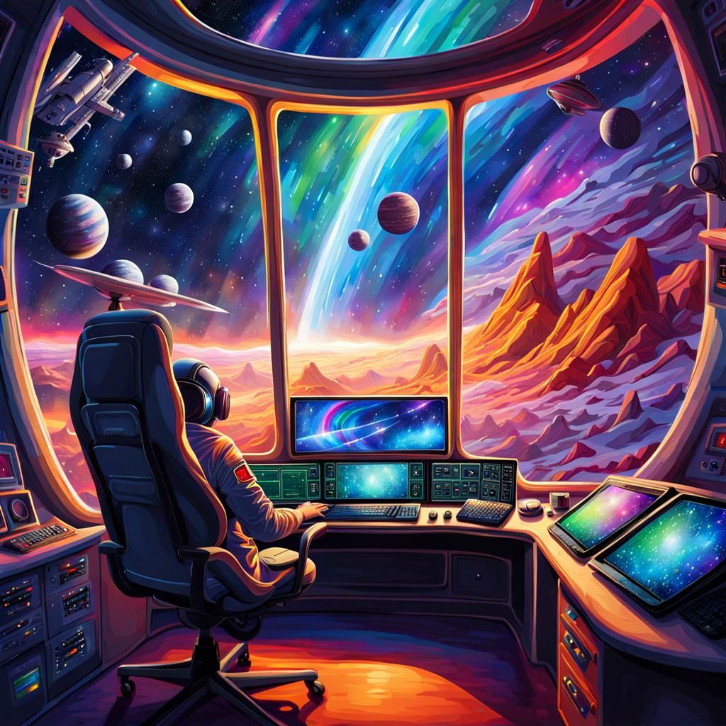 A vivid image of a spaceship control room viewed through a window. The scene features astronauts, falling stars and layers of magical rainbow colors in a realistic dreamscape.