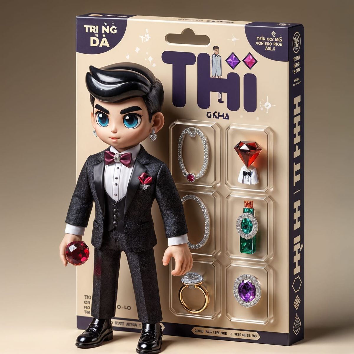 A luxurious toy packaging design featuring a gentleman in a black tuxedo surrounded by gemstones and accessories, set against a beige background with bold purple text and a modern logo.