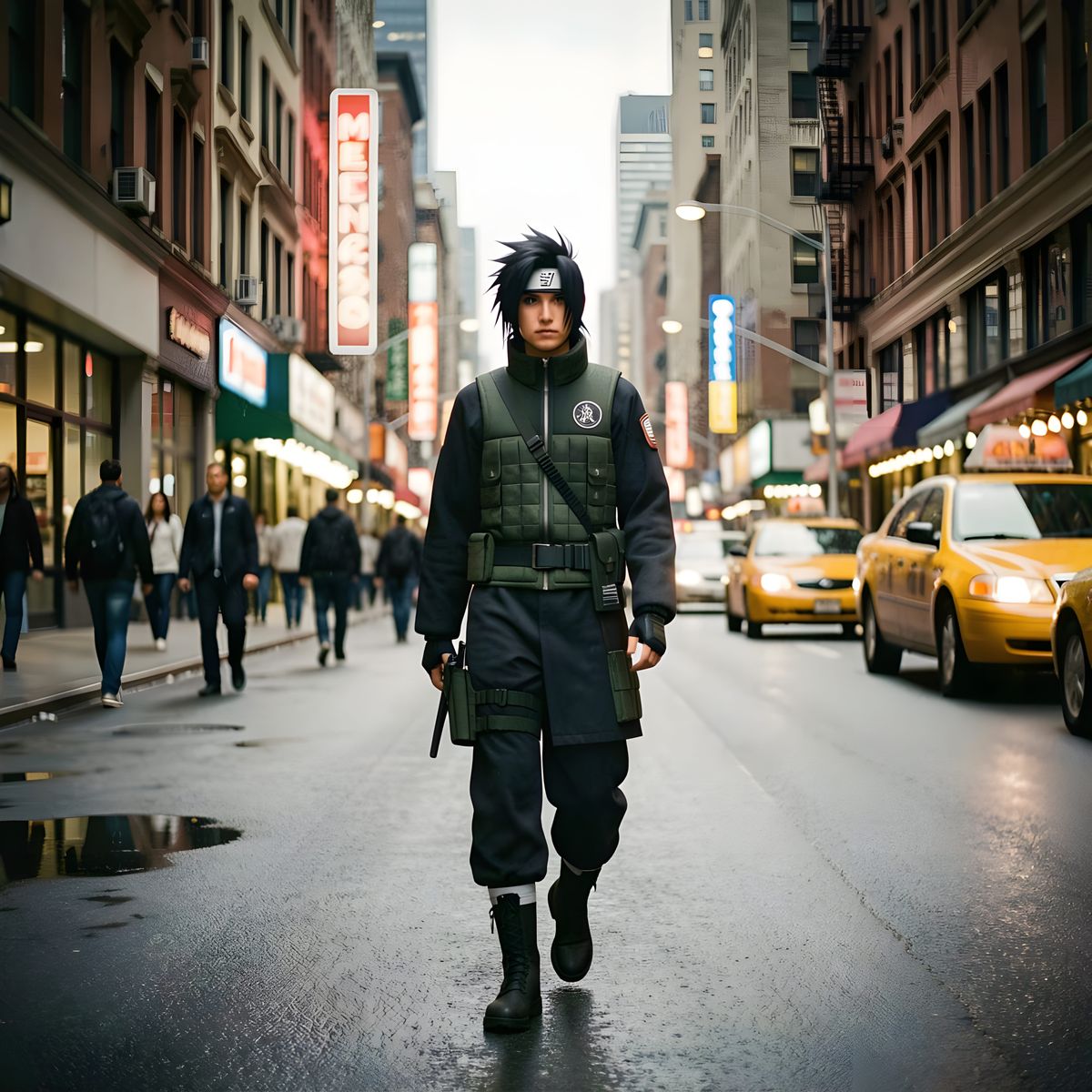 This image depicts Uchiha Itachi from Naruto walking through a realistic city. It's presented as a cinematic film still with dramatic lighting and atmospheric effects.