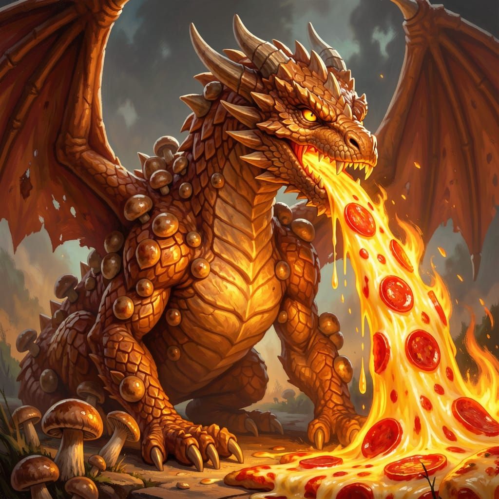A hyperrealistic digital painting of a majestic pizza dragon with pepperoni scales, breathing molten cheese. Mushrooms adorn its body. Features dramatic lighting and a shallow depth of field.