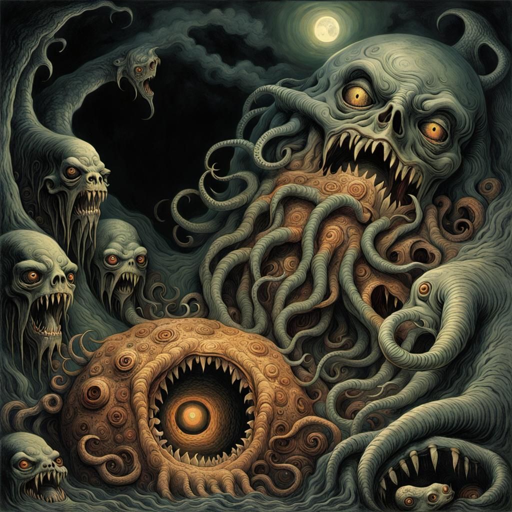 A nightmarish scene of amorphous horror with countless eyes and shapes, evoking a sense of cosmic dread. This image is inspired by gothic horror and dark surrealist art.