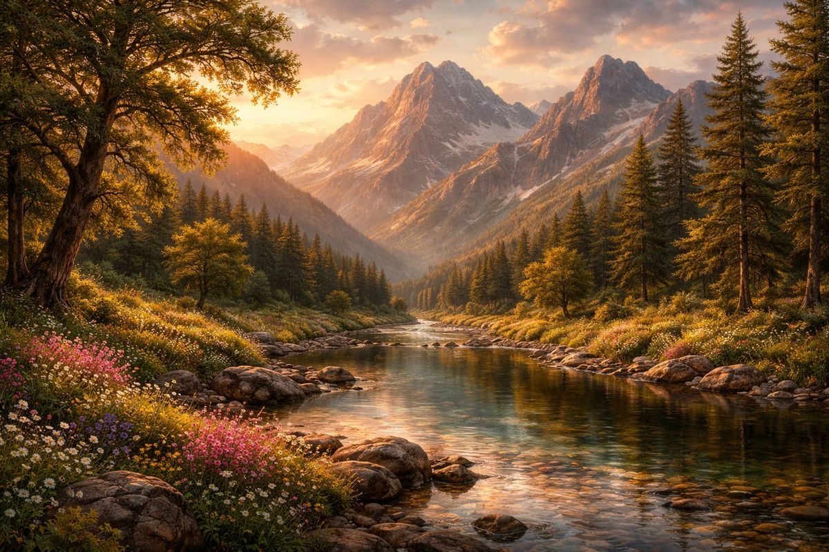 This hyperrealistic painting showcases a lush valley at sunset. Features include rugged, snow-dusted mountains, a clear river, wildflowers, and ancient trees, all bathed in warm golden light.