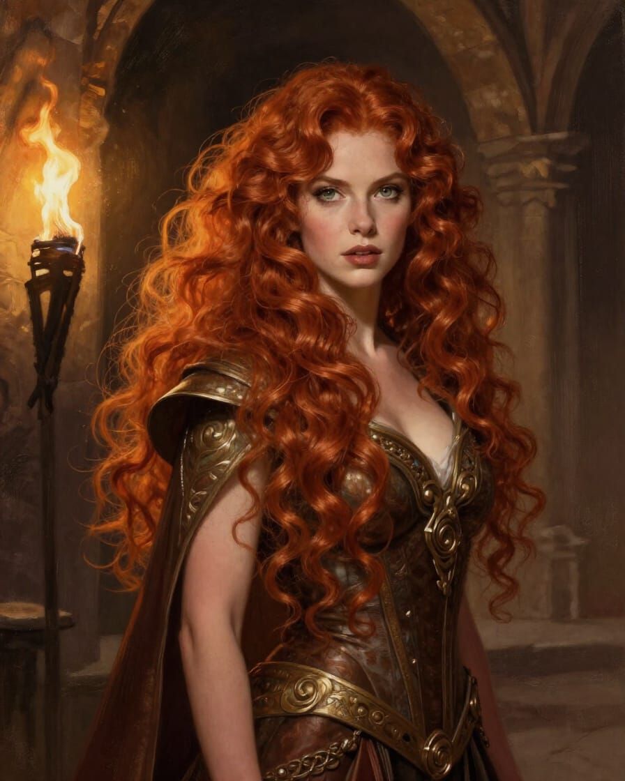 A striking image of a woman with flowing red hair in a stone hall, illuminated by torchlight. Rendered with dramatic lighting and rich textures in a detailed fantasy illustration style.