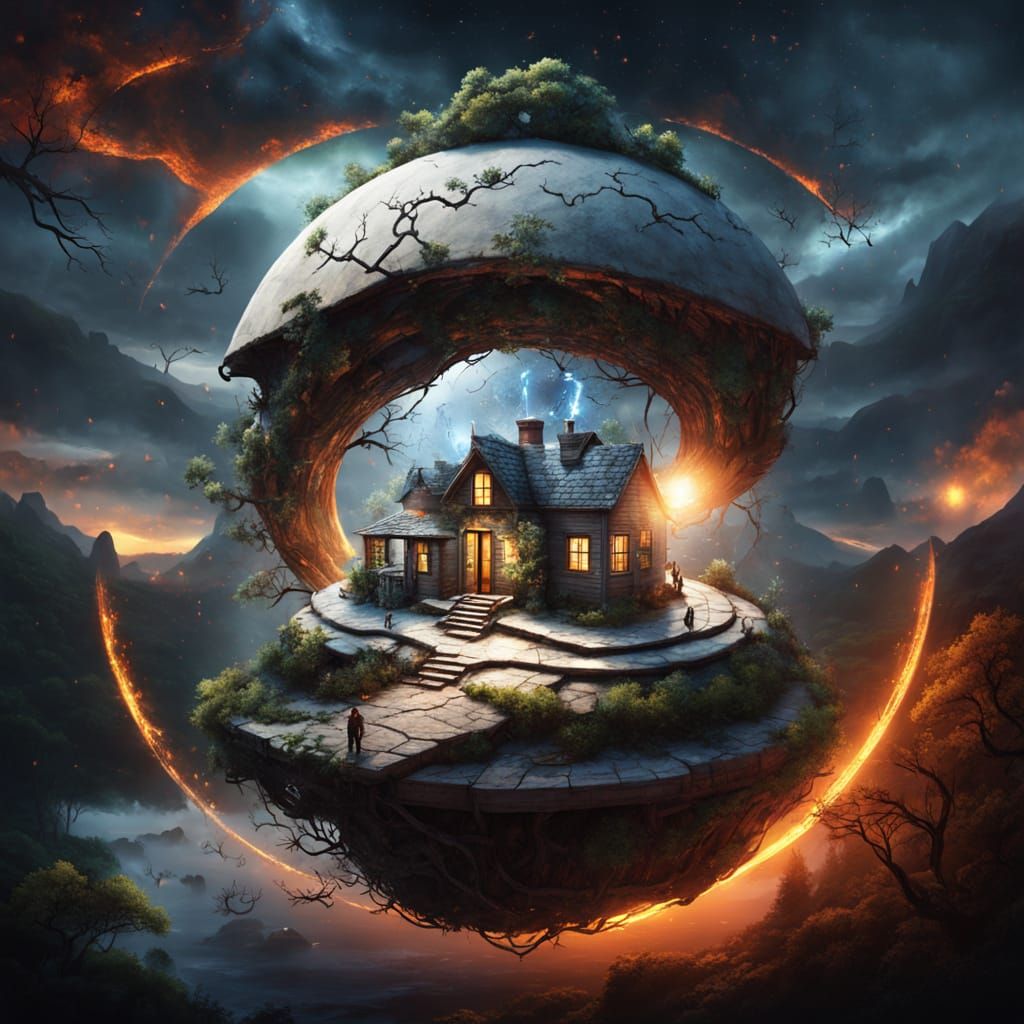 This image depicts a surreal scene within a cracked yin-yang stargate, featuring a figure on a path towards a dream room amidst diverse weather and seasons, rendered in a digital art style.