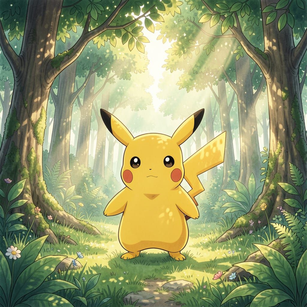 This image shows Pikachu in a vibrant forest clearing, bathed in ethereal light. Rendered in a detailed anime key visual style with deep colors and natural lighting.