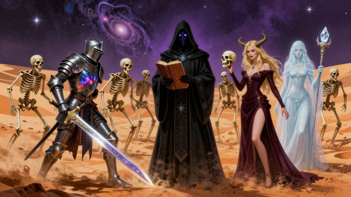 This image depicts a dark fantasy scene where skeletons emerge from orange desert sands to confront a party of adventurers. Dynamic lighting and intricate details highlight the epic confrontation.