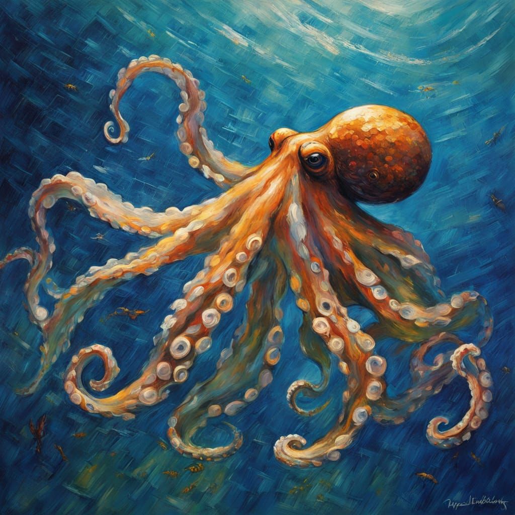 An impressionistic oil painting showing an octopus reaching for a shell in the deep ocean, with fish swimming by. Features thick, textured paint and vibrant colors with golden hour light.
