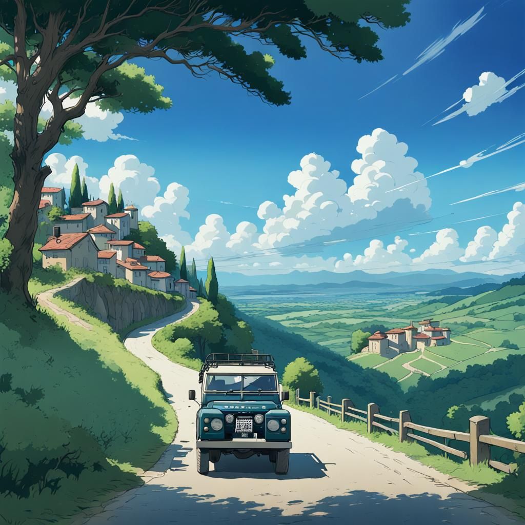 This image shows a Land Rover traveling on a road winding through Italian villages. The artwork evokes a Studio Ghibli animation style with vibrant colors and natural lighting.