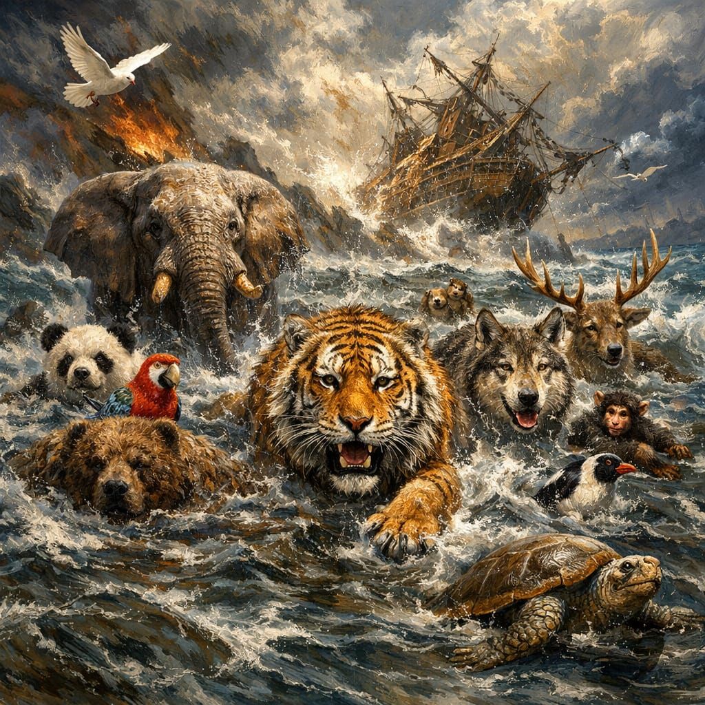 This image depicts a group of diverse animals reaching shore after a shipwreck. The scene is rendered with painterly realism and fine art CGI details, featuring high contrast and sharp focus.