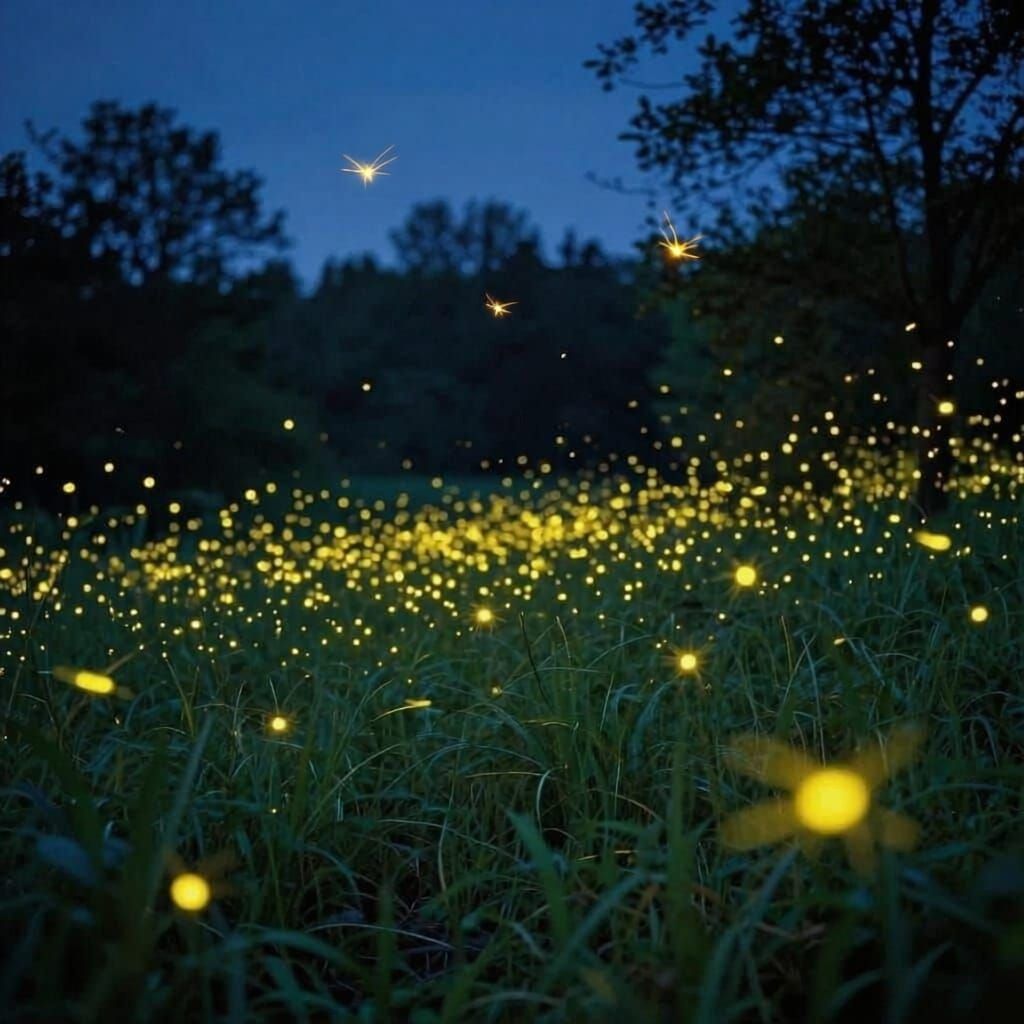 This image captures a breathtaking scene of millions of fireflies illuminating a dark field, creating a magical and serene atmosphere.
