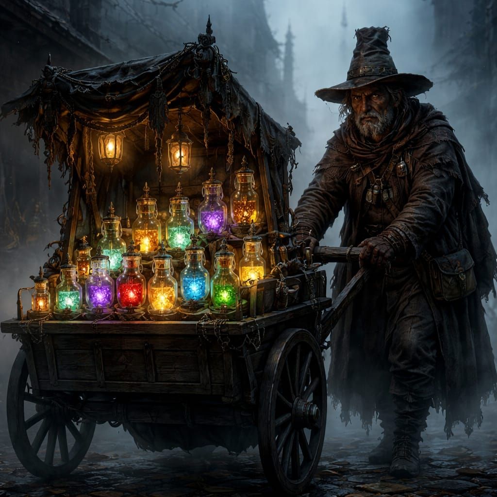 This image shows a detailed dark fantasy illustration of a traveling alchemist with a cart of glowing potions in a misty medieval city, featuring atmospheric lighting.