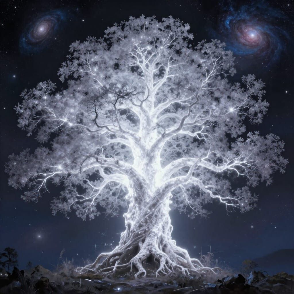 This image shows a majestic, ancient tree formed from starlight, with branches extending into a vibrant cosmic sky. Rendered as a hyper-detailed digital painting with fantasy and cosmic surrealism influences.