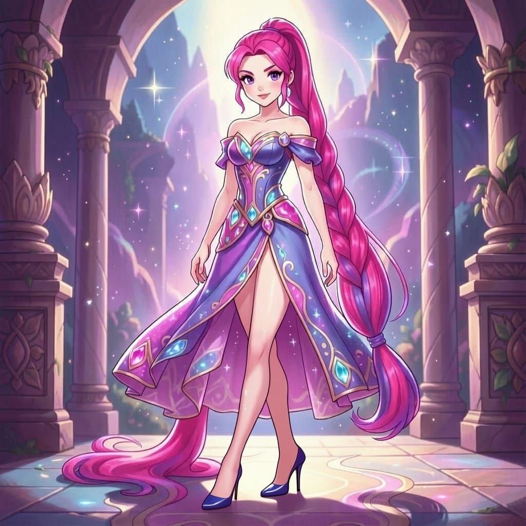 This image features a character inspired by the Winx Club, with long pink and purple braided hair, purple eyes, and pale skin, wearing a gemlight dress.