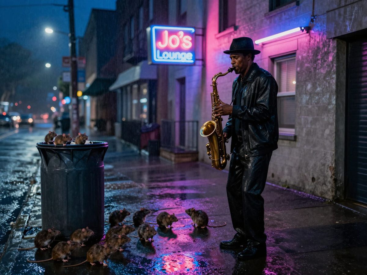 A noir-inspired photorealistic image of a jazz musician playing saxophone on a deserted, rain-slicked street at midnight. Rats gather by an overflowing trash can, captivated by the music under a flickering neon sign.