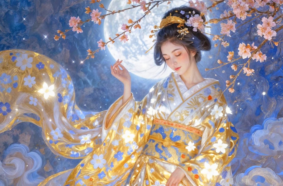 This image shows a luminous, serene geisha with closed eyes, detailed in an impressionist style with impasto techniques. A glowing moon and ethereal floral elements create a magical atmosphere.