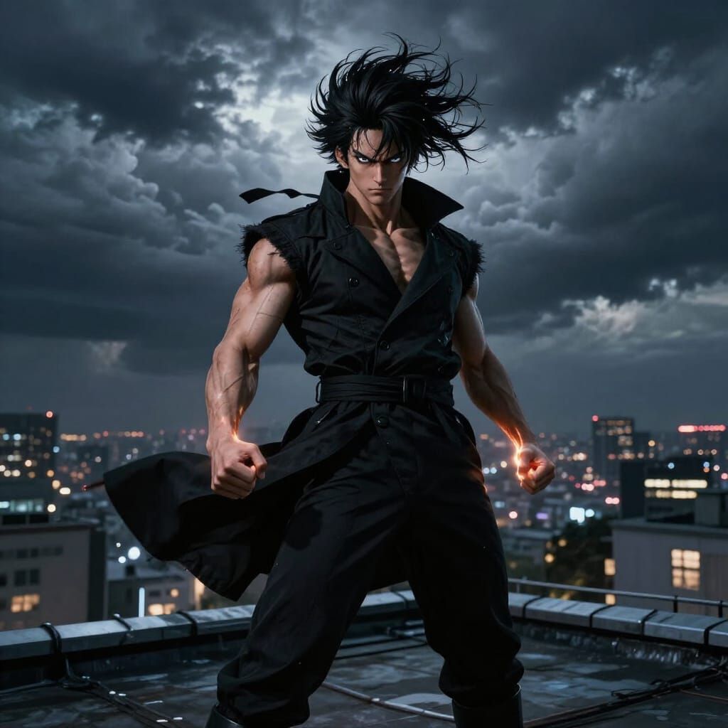 A muscular anime hero stands on a stormy rooftop at night, energy glowing around his fists. Photorealistic lighting and cinematic tension create a dramatic, high-detail scene.