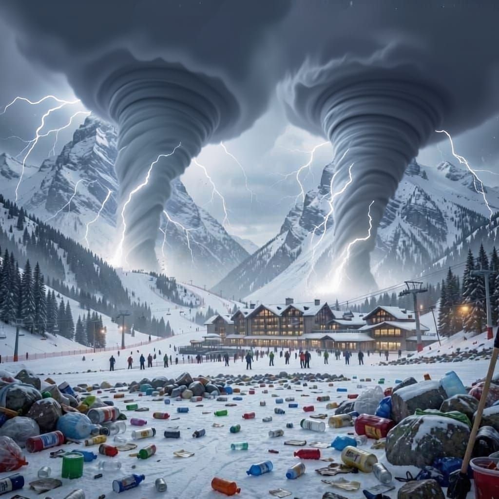 This image depicts a dramatic scene of two mountains attacking a littered ski resort within a powerful snowy tornado. Lightning crackles intensely within the storm.