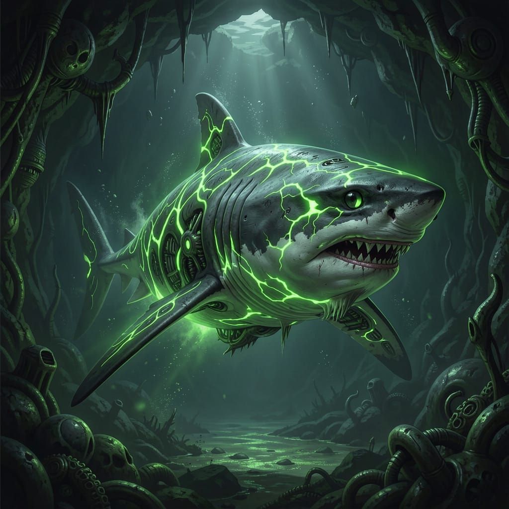 This image depicts a menacing great white shark with glowing green bioluminescent patterns, exploring a dark ocean trench. The artwork features biomechanical horror elements and atmospheric lighting.