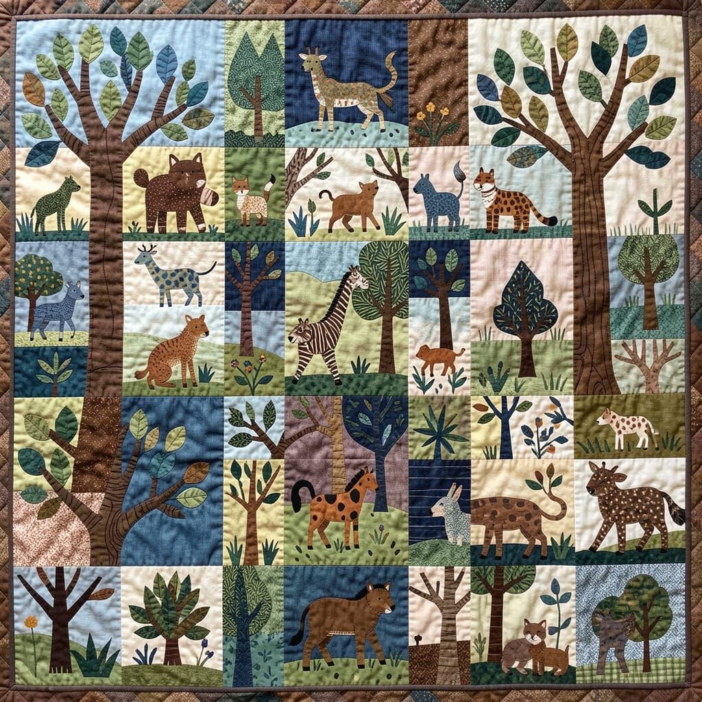 This image showcases a cozy, handmade patchwork quilt featuring a whimsical forest. Various animals and trees are stitched together in a folk art style, using a rich, textured palette of blues, greens, and earthy browns.