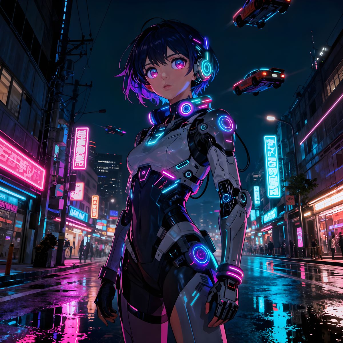 This image depicts an anime-style futuristic character in a vibrant, neon-lit cyberpunk city at night, featuring dramatic lighting and holographic reflections.