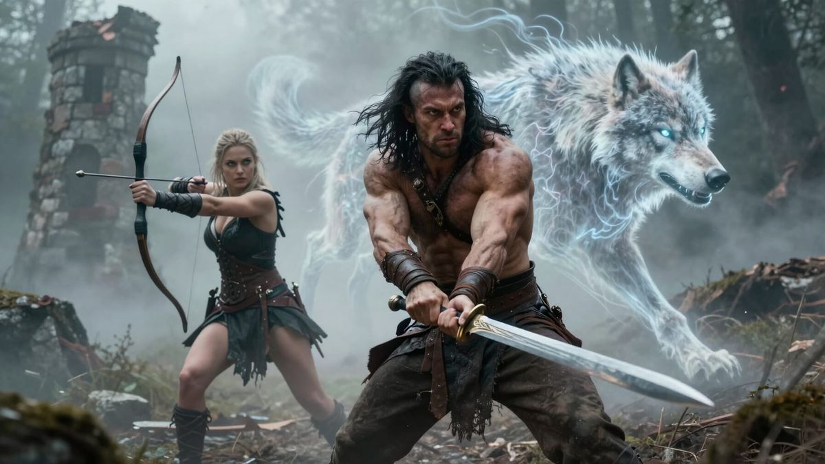 This dynamic image shows a muscular barbarian and an archer facing a spectral wolf attack in a ruined forest. Cinematic action shot, dynamic lighting.