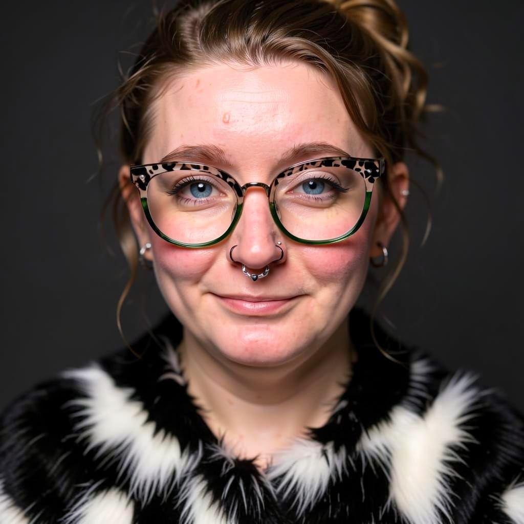 A striking portrait of an individual with piercing blue eyes and a distinctive black and white fur pattern. The image features subtle bokeh and studio lighting, creating a professional and artistic feel.