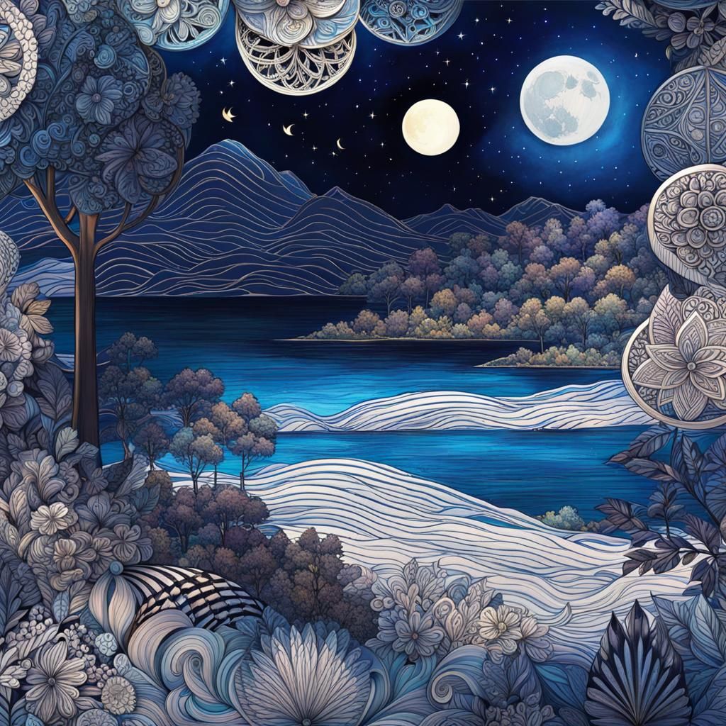 This image shows a black cat with intricate zentangle patterns, subtly illuminated by moonlight. The artwork features deep colors and fantastical details, reminiscent of cosmic illustrations.