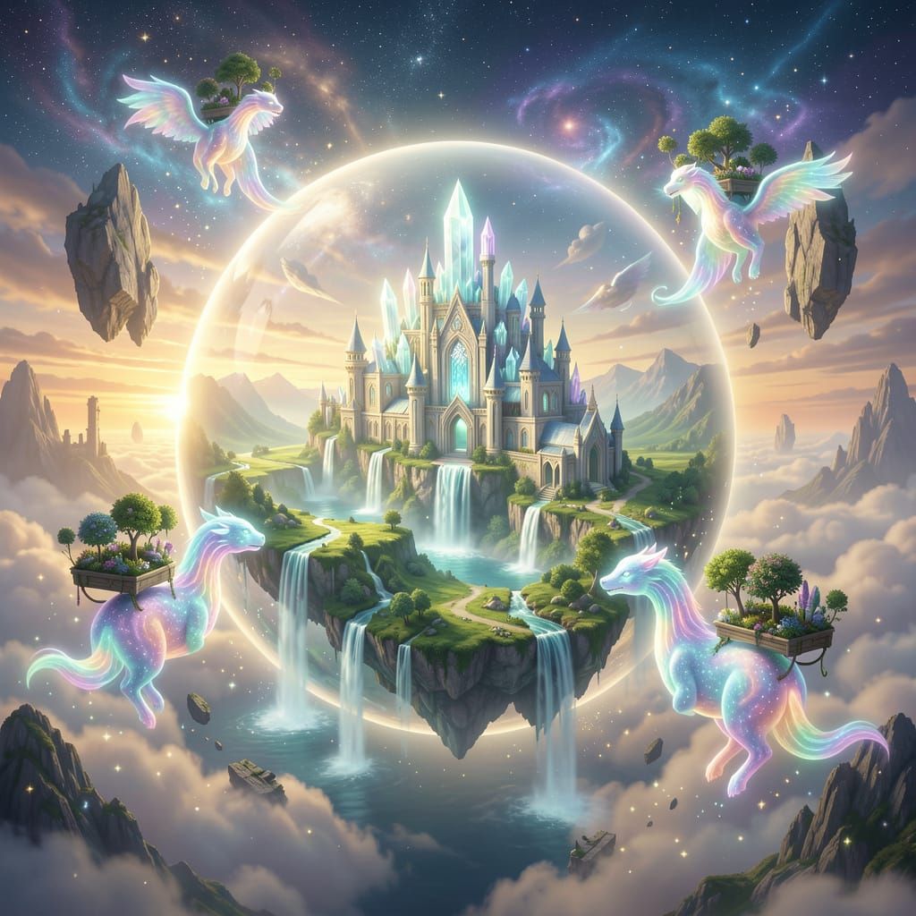 This image depicts a colossal, surreal floating kingdom within a luminous orb, set against a dreamlike sky. It features glowing valleys, radiant waterfalls, and crystal palaces, with mythical sky creatures and cosmic clouds.