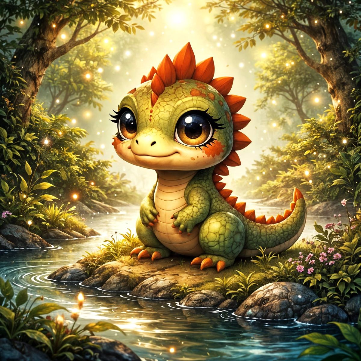 This image shows a baby Chibi T-Rex on a misty riverbank, rendered in a pop-surrealism style with playful abstract geometry and dreamlike details. Features lush vegetation, dappled sunlight, and intricate scale textures.