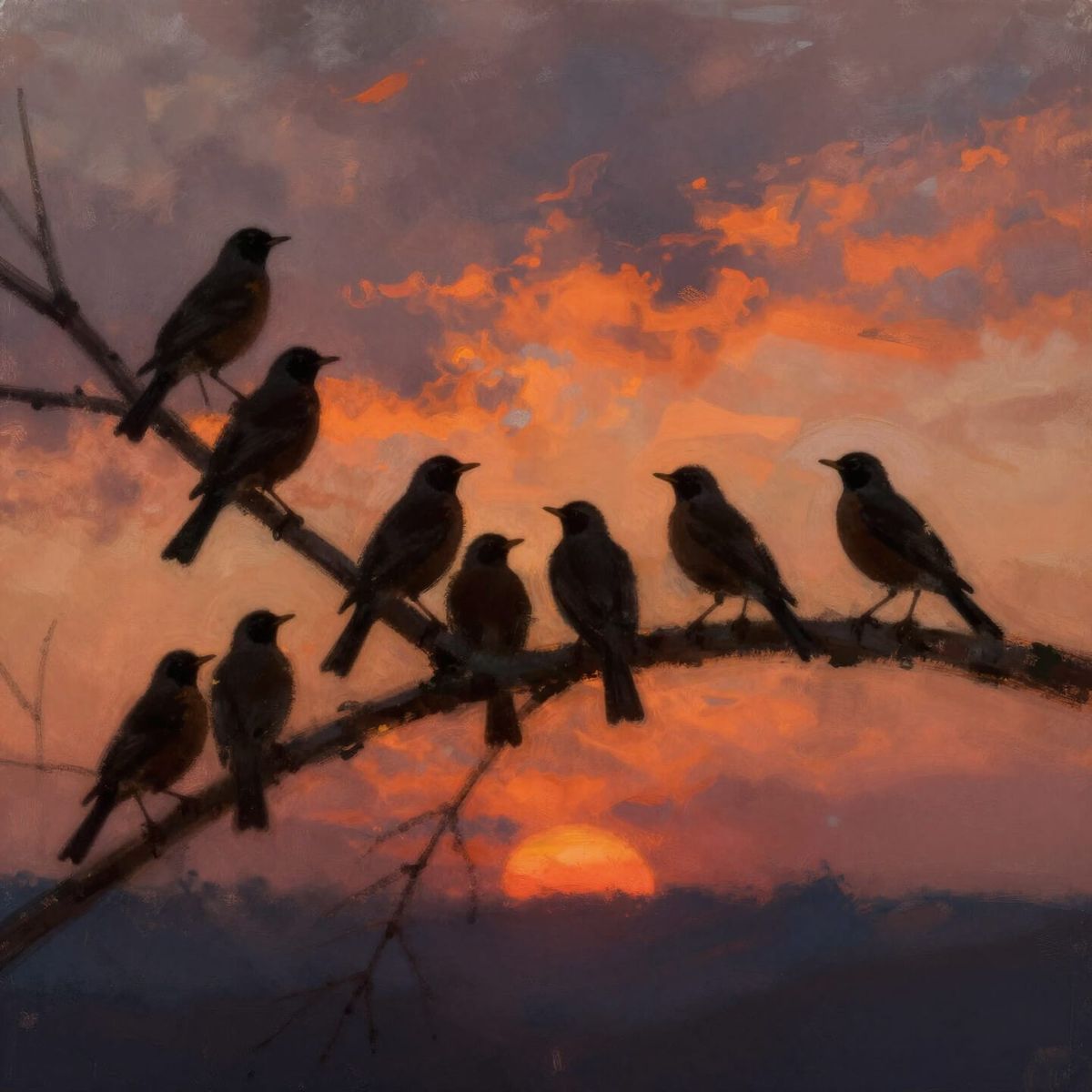 This image shows a flock of robins on a tree branch at twilight. The sky features dramatic, fiery colors reminiscent of atmospheric landscape paintings with expressive brushstrokes.