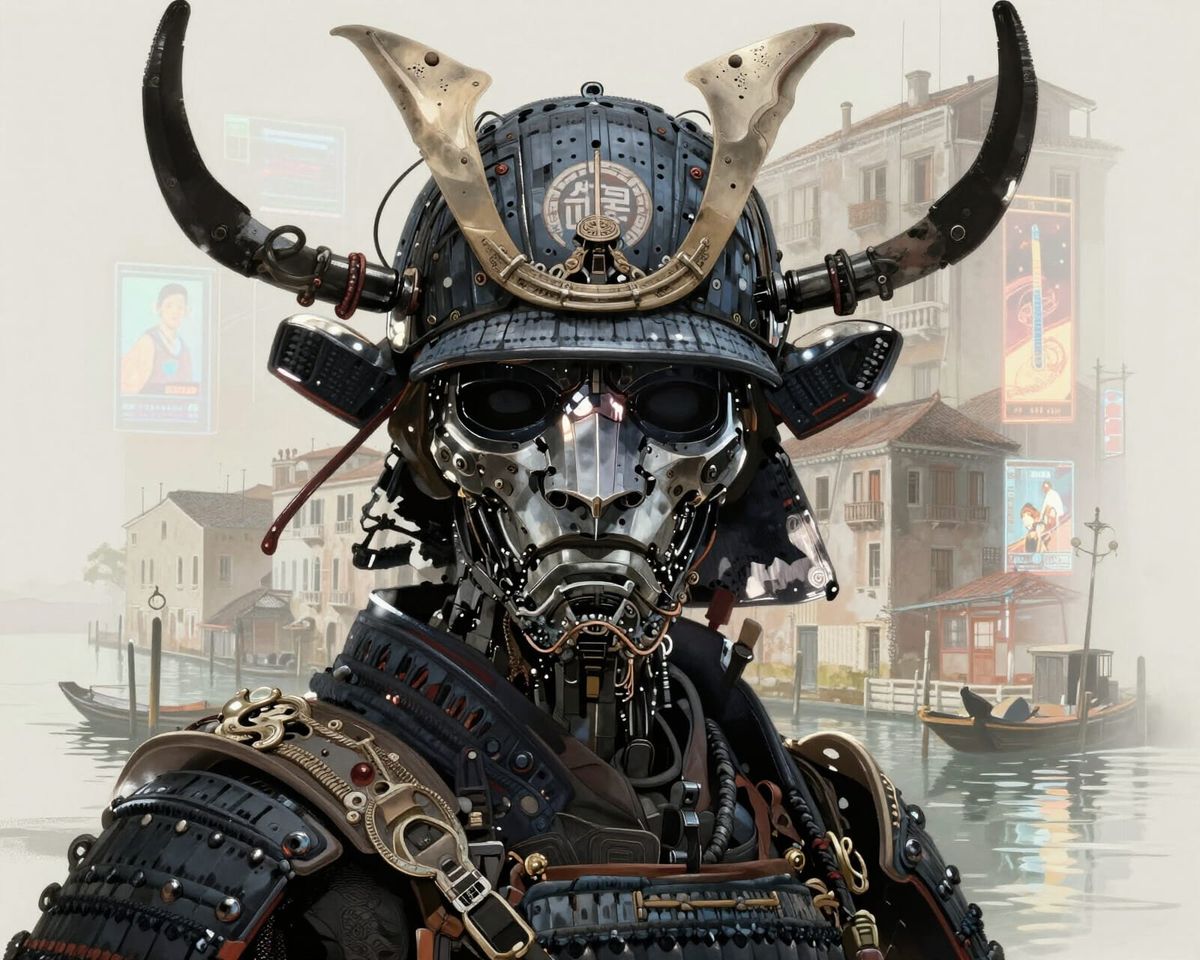 This image shows a lone samurai warrior in detailed cybernetic armor navigating the canals of a futuristic Venice, illuminated by holographic ads in a dark cyberpunk aesthetic.