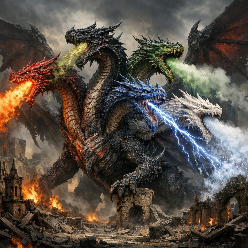 This image depicts Tiamat, the Queen of Dragons, a fearsome five-headed dragon with elemental breath attacks, standing amidst the ruins of a medieval city. The art style is hyperrealistic and highly detailed.