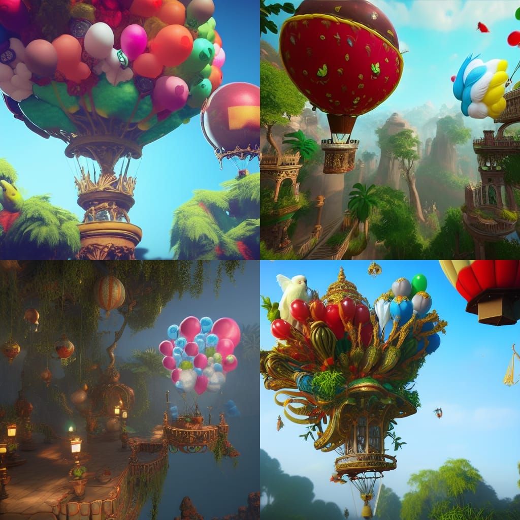 A vibrant image of parrot and cockatoo balloons floating in a fantasy video game world. The artwork is intricately detailed with ornate, rococo-inspired elements and rendered as 4K digital art.