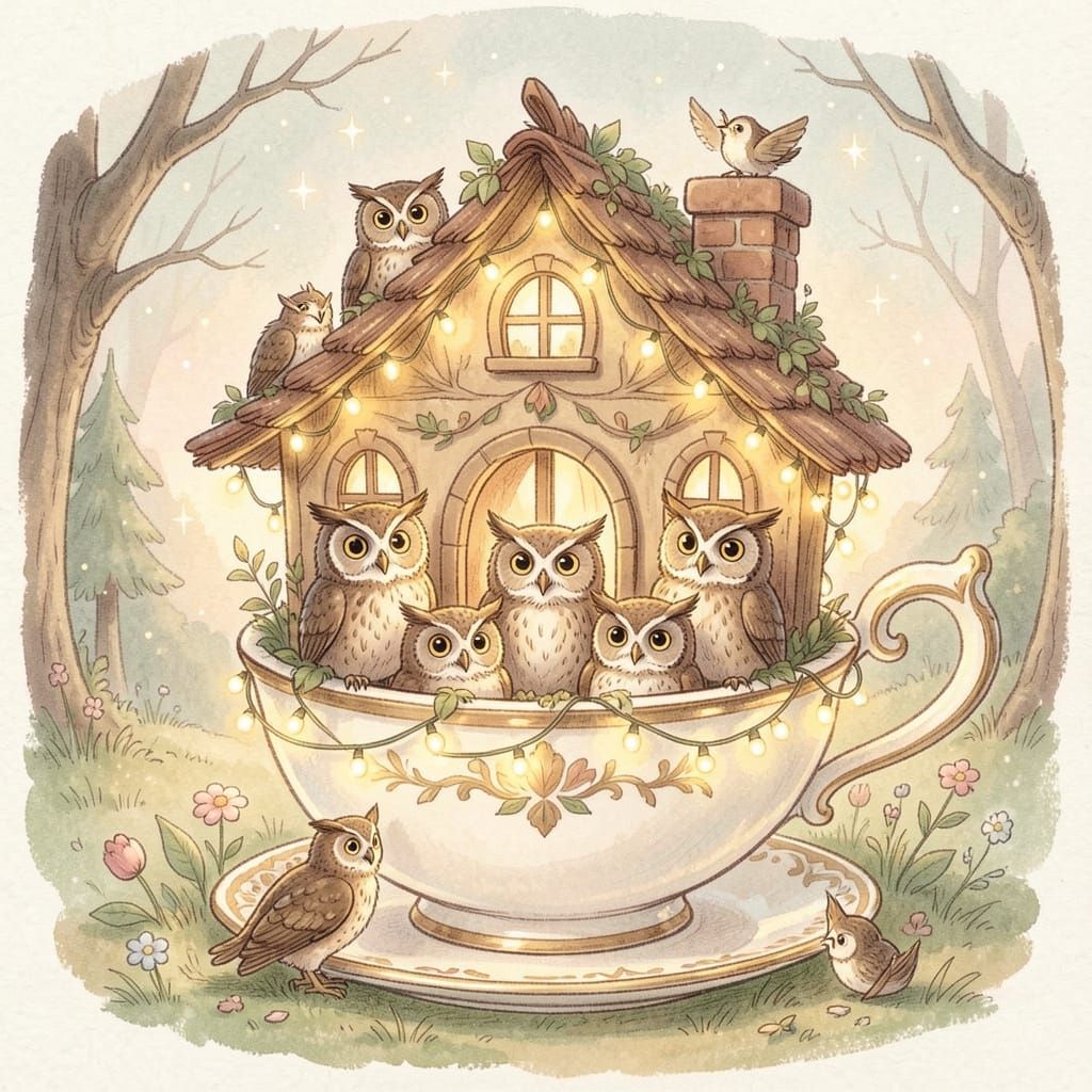 A charming illustration of an owl family living in a teacup house, bathed in soft, warm light. Features a magical storybook art style with a whimsical atmosphere.