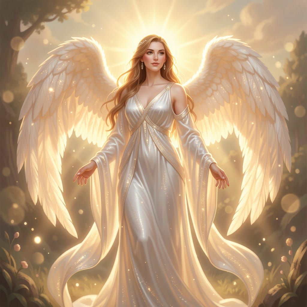This image showcases a divine woman with large feathered wings, bathed in golden hour sunlight. Rendered in a painterly digital art style with soft, glowing light and bokeh.