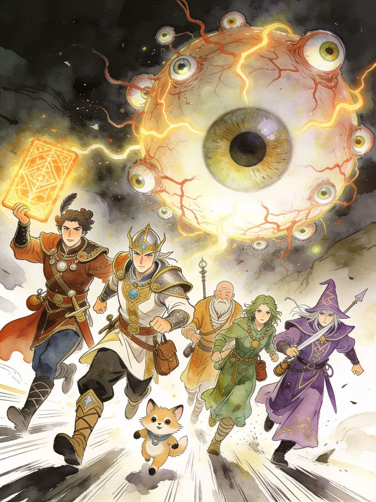 This dynamic ink and watercolor image captures a group of diverse fantasy adventurers escaping a giant, cursed floating eyeball. They wear ornate outfits and carry gear, with one holding a glowing artifact, inspired by D&D artwork.