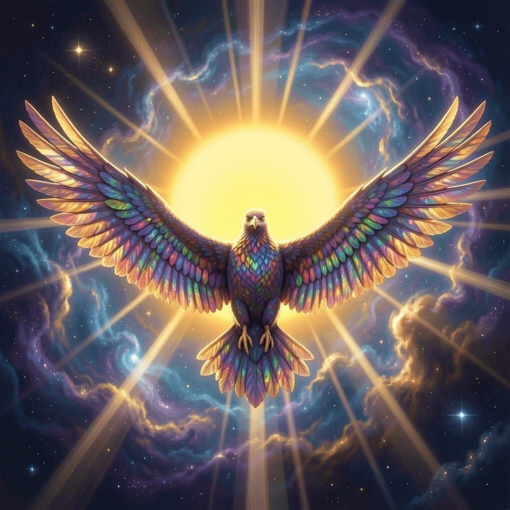 A luminous scene of a cosmic bird with outstretched wings before a sun, emitting brilliant rays of light. This image captures a celestial spectacle.