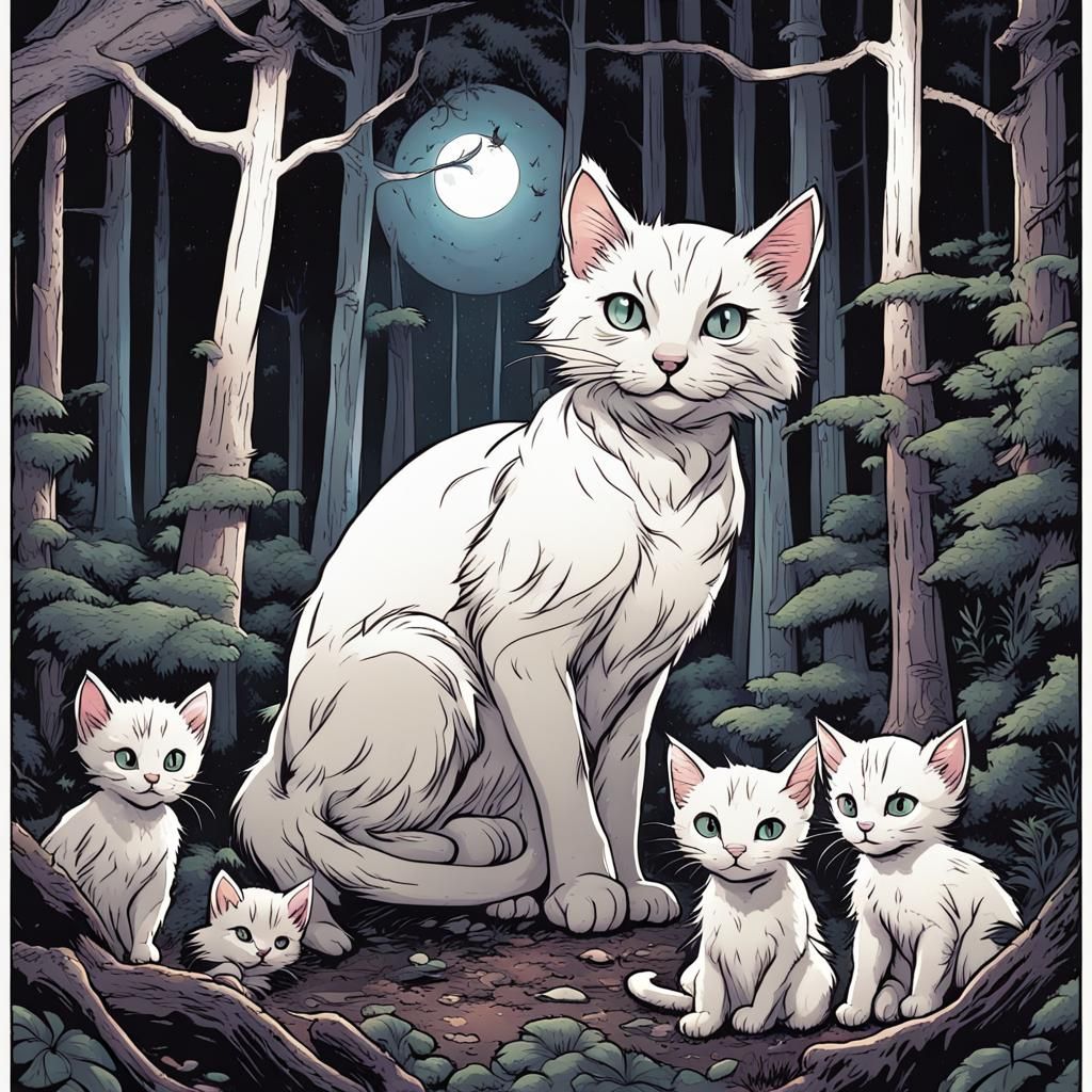 This image shows a mother cat with her kittens in a forest at night under the moonlight. The artwork is reminiscent of comic book art, with smooth, perfect lines.