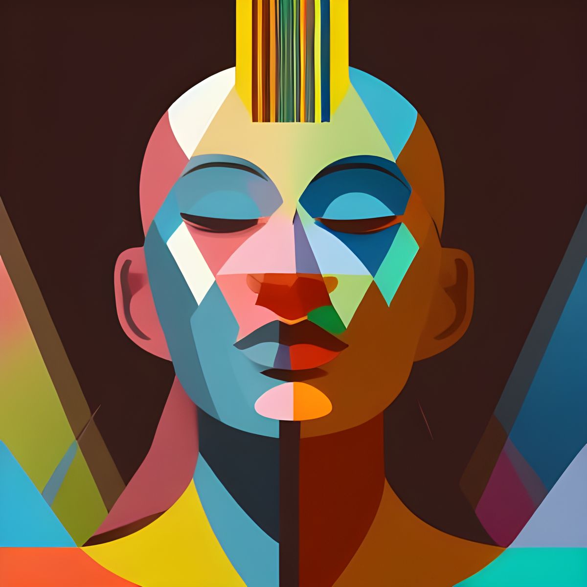 This image shows an abstract geometric design representing the mind. The digital art is vibrant, symmetrical, and uses a triadic color scheme in a pop art style.