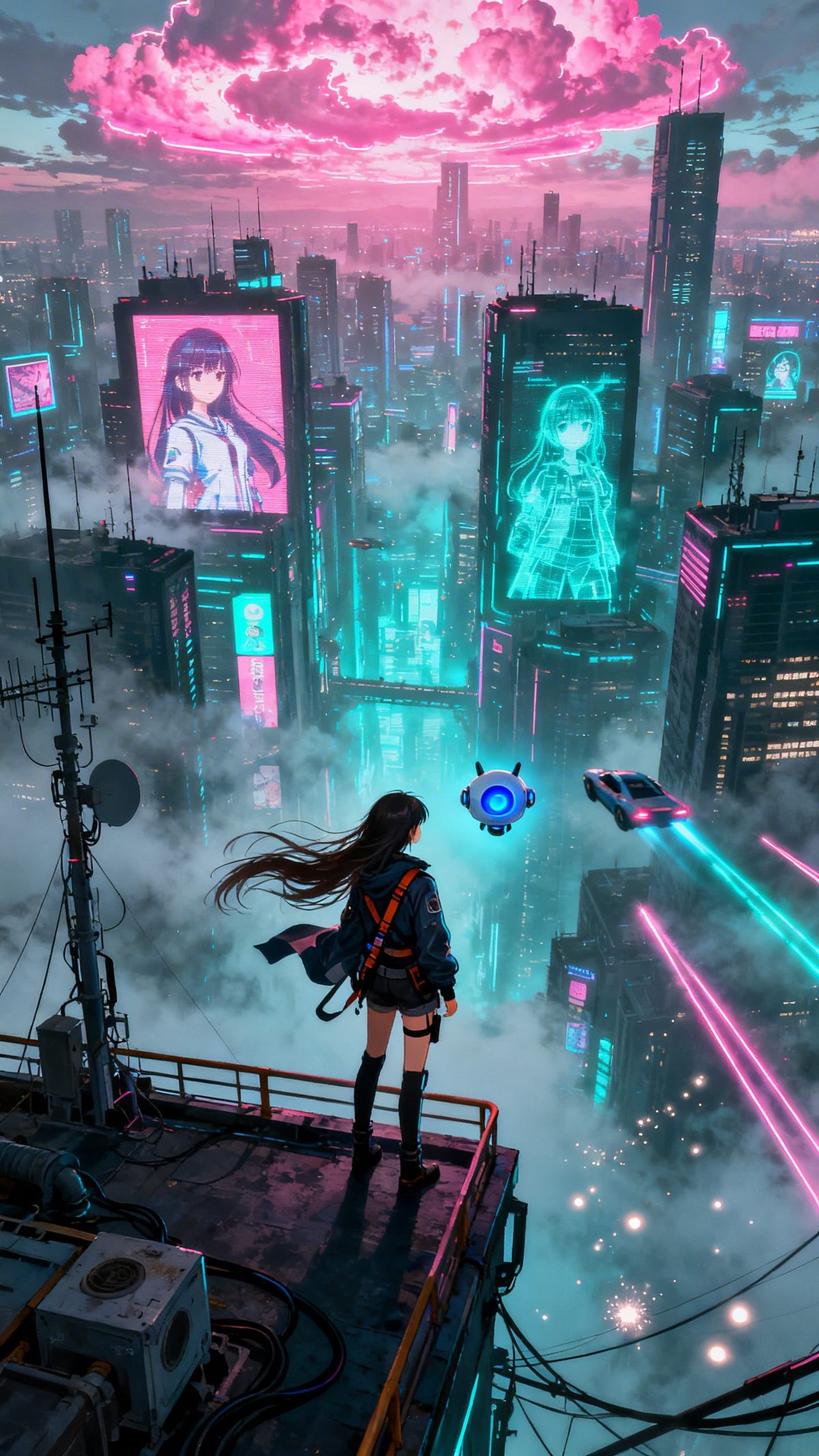 In a city of endless lights, she stands above the clouds with her silent companion.